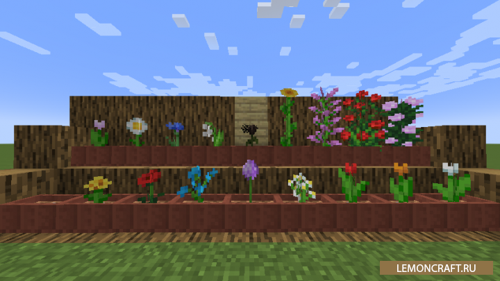 Мод на цветочные чары Floral Enchantment небольшой декоративный мод, который ориентирован на работу с цветами и другой растительностью. Мод добавит в игру различные кусты из которых вы сможете получить лозу. Так же в игре появится большое количество вариантов мшистого булыжника и вместительные цветочные горшки, которые смогут вместить несколько цветов.