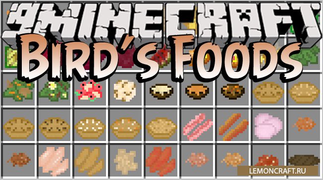 Мод Bird's Foods призван пополнить и разнообразить виды еды в игре майнкрафт. В игре появится более 30 новых видов еды, которые удовлетворят вкус любого гурмана.